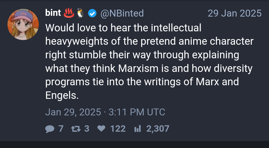 >>109547944>bint being an unironic markistEvery day it seemed Bint would retweet some schizo hammer and sickle flaired accounts in between taking swipes at insubordinate chuubas