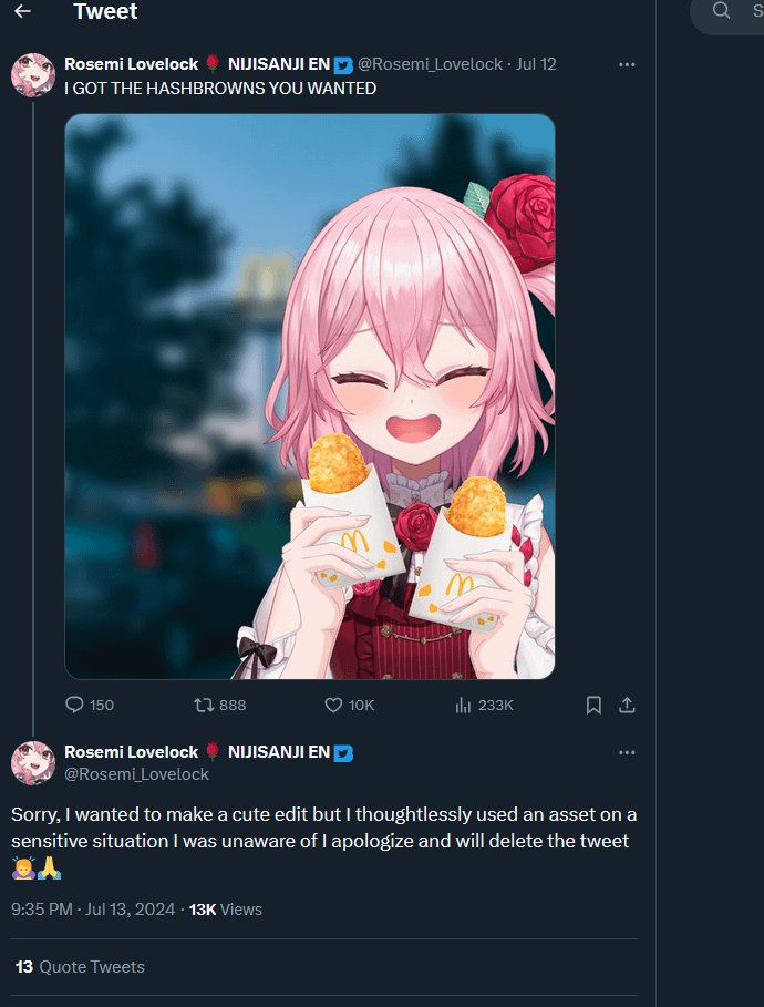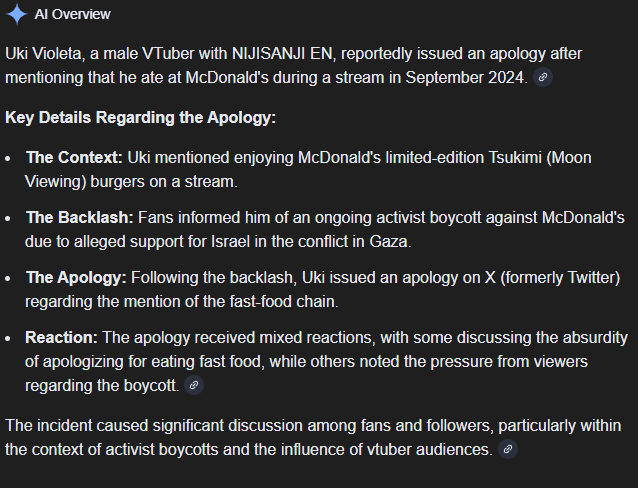 >>109549107>>109549512Oh yeah I remember this it was the dumbest shit possible. Yes, Nijisanji vtubers really apologized for mentioning Mcdonalds. It was soon after the attacks on Israel and a Franchisee in Israel announced they were donating Mcdonalds meals to IDF personnel. Note that this isn't the same thing as Mcdonalds the US corporation donating meals to the IDF, but for some people it doesn't matter, and they were demanding random Americans boycott Mcdonalds over it and even made Niji streamers bend the knee for talking about Mcdonalds