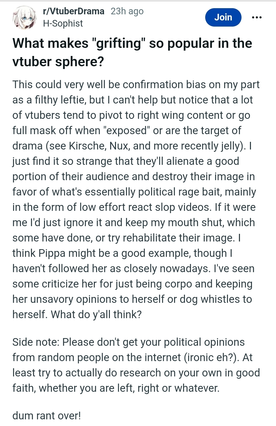 >>109548673The fact that overtly leftoid vtubers fail to get much traction within the scene ought to be informative, but of course this is leftoids we're talking about>>109548893Yes, look up "POCD"Also this is the freak who hooked a vibrating butt plug up to his computer and set it up to activate upon certain interactions within a childrens' game