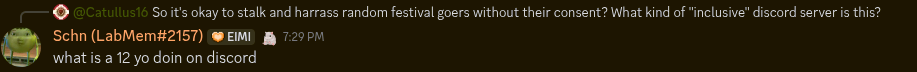 >>109551995>Anon I'm not saying they should ban her from the Discord.They should. Anyone else would have been banned for that. You and I both know she's being protected.