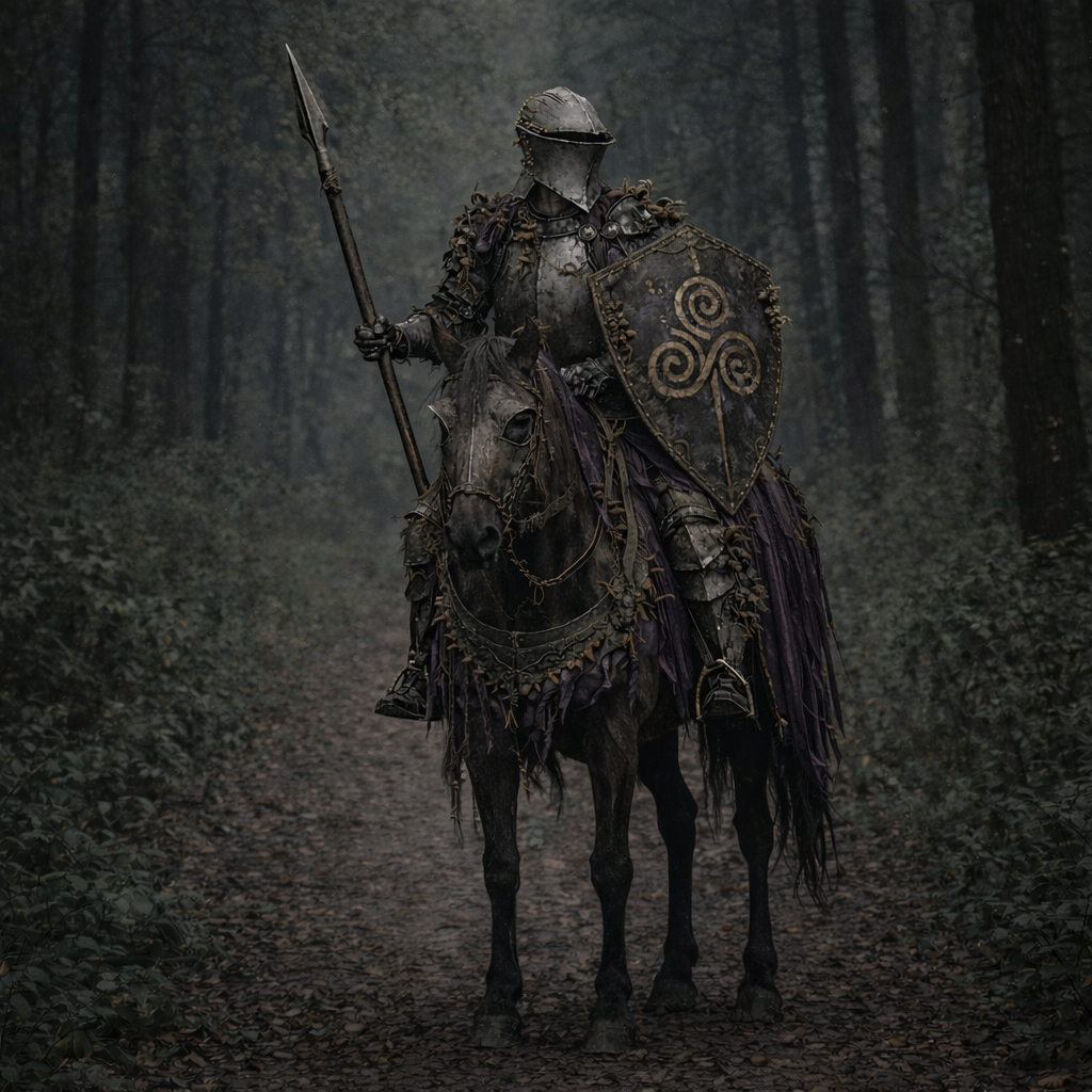 >>109556256Sir Kynnecho of House MenaceGray/gunmetal oxidized plate with purple accents and mushrooms/fungus peaking from between the gaps in armor and on the horse. Gothic era armor, a stechhelm if possible, damask cloth patterns that are stained and lightly tattered.Background could be deep, dark forest with fireflies and random purple goop puddles.Basically like this, but you can gen it your own way so it fits better with the other entries if that's your prerogative. A reference for the chuuba if needed: https://x.com/menmakii/status/2002288397964984536/