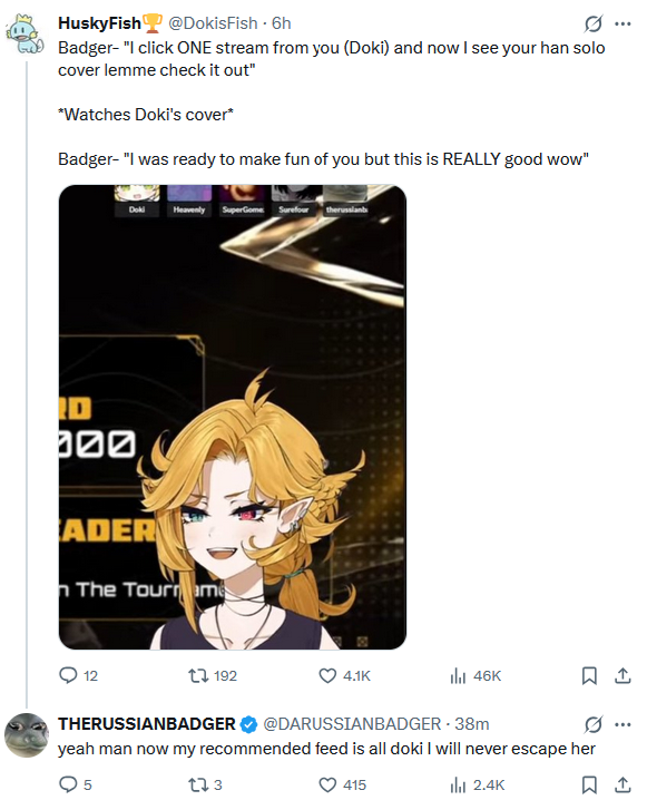 >>109558277This happened to me, I clicked on Dokibird once and my feed became Dokibird central. Not complaining btw, I like some of the videos and it's been than what my feed was before this.