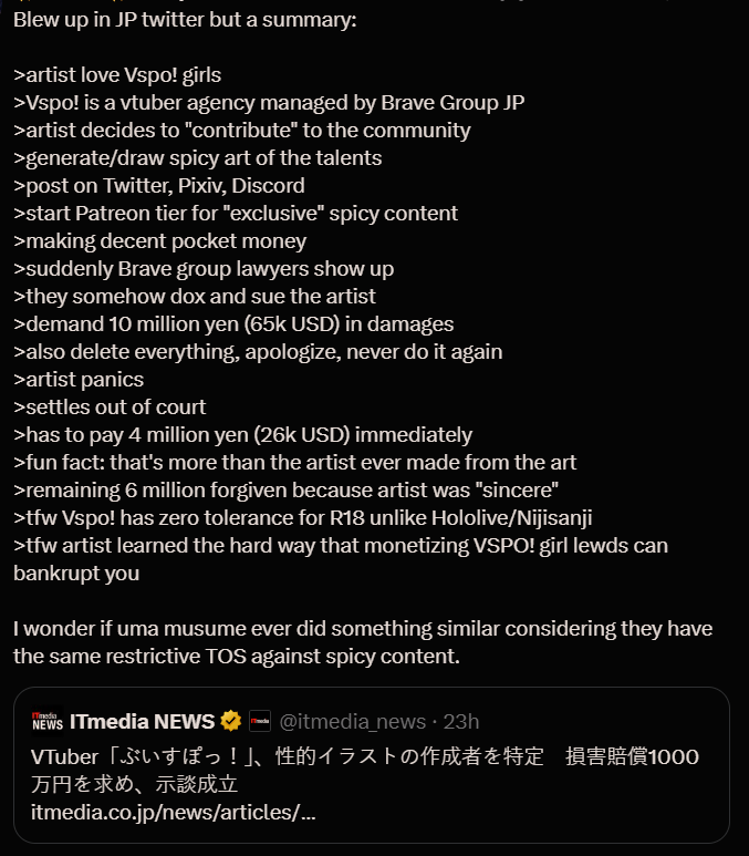 >>109562247I think VSPO's objection to R18 art is retarded but they've always been 100% clear about the rule and they've always made it clear they'll go after anyone making it. So zero sympathy for the artist; he knew the risks.