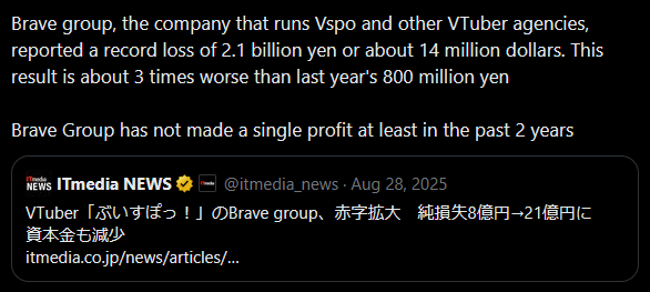 >>109562247their parent company, Brave group, is probably still in the red.If they crash and the ship sinks, how many big name vtubers will be in trouble?not just vspo but every single company under them