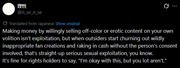 >>109562247i don't understand the fusswhat's wrong with making lewds of the avatar?can't they just separate the avatar from the person behind it?it's not like they used their real life appearances as references for the avatars