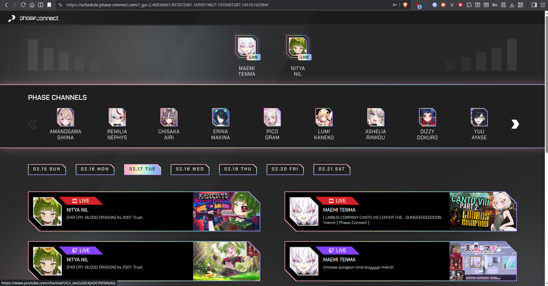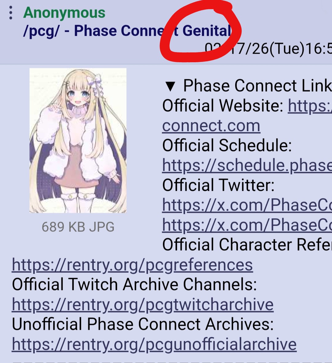 ▼ Phase Connect LinksOfficial Website: https://phase-connect.comOfficial Schedule: https://schedule.phase-connect.comOfficial Twitter: https://x.com/PhaseConnect | https://x.com/PhaseConnectJPOfficial Character References: https://rentry.org/pcgreferencesOfficial Twitch Archive Channels: https://rentry.org/pcgtwitcharchiveUnofficial Phase Connect Archives: https://rentry.org/pcgunofficialarchive––––––––––––––––––––––––––––––––––◆【Lia】https://x.com/rinkouashelia | https://youtube.com/RinkouAshelia | https://twitch.tv/asheliarinkou◆【Utatane Nasa】転寝ナサ (JP) https://x.com/UtataneNasa | https://youtube.com/UtataneNasa | https://twitch.tv/utatanenasa◆【Hakushika Iori】白鹿いおり (JP + EN) https://x.com/hakushikaiori | https://youtube.com/HakushikaIori | https://twitch.tv/iorihakushika◆【Fujikura Uruka】https://x.com/fujikurauruka | https://youtube.com/FujikuraUruka | https://twitch.tv/fujikurauruka◆【Shisui Michiru】紫翠みちる (JP) https://x.com/shisuimichiru | https://youtube.com/ShisuiMichiru | https://twitch.tv/michiru_shisui◆【Tenma Maemi】https://x.com/tenmamaemi | https://youtube.com/TenmaMaemi | https://twitch.tv/tenma◆【Pipkin Pippa】https://x.com/pipkinpippa | https://youtube.com/PipkinPippa | https://twitch.tv/pippa––––––––––––––––––––––––––––––––––◆【Kaneko Lumi】https://x.com/kaneko_lumi | https://youtube.com/KanekoLumi | https://twitch.tv/kanekolumi◆【Fuura Yuri】[Terminated] https://x.com/AmarisYuri | Archive: https://youtube.com/@TheNationalFuuraYuriArchive◆【Dizzy Dokuro】https://x.com/dizzydokuro | https://youtube.com/@dizzydokuro | https://twitch.tv/dizzydokuro◆【Jelly Hoshiumi】https://x.com/jellyhoshiumi | https://youtube.com/@jellyhoshiumi | https://twitch.tv/jellyhoshiumi◆【Ember Amane】https://x.com/emberamane | https://youtube.com/@EmberAmane | https://twitch.tv/emberamane◆【Clio Aite】https://x.com/ClioAite | https://youtube.com/@ClioAite | https://twitch.tv/clioaite◆【MariMari_en】https://x.com/MARIMARI_EN | https://youtube.com/@MARIMARI_EN | https://twitch.tv/marimari_en◆【Eepy Sleepy】https://x.com/EepySleepyCh | https://youtube.com/@EepySleepyCh | https://twitch.tv/EepySleepy––––––––––––––––––––––––––––––––––◆【Remilia Nephys】https://x.com/Remilia_Nephys | https://youtube.com/RemiliaNephys | https://twitch.tv/remilianephys◆【Chisaka Airi】https://x.com/ChisakaAiri | https://youtube.com/ChisakaAiri | https://twitch.tv/chisakaairi◆【Amanogawa Shiina】https://x.com/AmanogawaShiina | https://youtube.com/AmanogawaShiina | https://twitch.tv/amanogawashiina◆【Himemiya Rie】https://x.com/HimemiyaRie | https://youtube.com/HimemiyaRie | https://twitch.tv/himemiyarie◆【Erina Makina】https://x.com/ErinaMakina | https://youtube.com/ErinaMakina | https://twitch.tv/erinamakina◆【Komachi Panko】https://x.com/komachipanko | https://youtube.com/KomachiPanko | https://twitch.tv/komachipanko––––––––––––––––––––––––––––––––––◆【Runie Ruse】https://x.com/RunieRuse | https://youtube.com/@RunieRuse | https://twitch.tv/RunieRuse◆【Eimi Isami】https://x.com/eimiisami | https://youtube.com/@eimiisami | https://twitch.tv/eimiisami◆【Muu Muyu】https://x.com/Muu_Muyu | https://youtube.com/@MuuMuyu | https://twitch.tv/MuuMuyu◆【Hikanari Hina】https://x.com/HikanariHina | https://youtube.com/@HikanariHina | https://twitch.tv/HikanariHina◆【Saya Sairroxs】[Graduated] https://x.com/sayasairroxs | https://youtube.com/@sayasairroxs | https://twitch.tv/sayasairroxs––––––––––––––––––––––––––––––––––◆【Kannagi Loki】巫ロキ (JP) https://x.com/kannagiloki | https://youtube.com/@kannagiloki◆【Kokoromo Memory】[Graduated] https://x.com/kokoromomemory | https://youtube.com/@kokoromomemory_ | https://twitch.tv/kokoromomemory◆【Gram Pico】倉夢ぴこ (JP) https://x.com/grampico_ | https://youtube.com/@grampico | https://twitch.tv/grampico◆【Ayase Yuu】絢世ユウ (JP) https://x.com/ayaseyuuu | https://youtube.com/@ayaseyuu | https://twitch.tv/ayaseyuu_◆【Kaminari Clara】歌美鳴クララ (EN + JP) https://x.com/kaminariclara_ | https://youtube.com/@kaminariclara | https://twitch.tv/kaminariclara––––––––––––––––––––––––––––––––––◆【Malice Evermore】https://x.com/MaliceEvermore | https://youtube.com/@maliceevermore | https://twitch.tv/maliceevermore◆【Nitya Nil】https://x.com/Nitya_Nil | https://youtube.com/@Nitya_Nil | https://twitch.tv/nitya_nil◆【Wilhelmina Frost】https://x.com/wilhelminafr0st | https://youtube.com/@wilhelminafrost | https://twitch.tv/wilhelminafrost◆【Bibi Biscuit】https://x.com/BibiBiscuitCh | https://youtube.com/@bibibiscuitch | https://twitch.tv/bibibiscuitch◆【Anya Nyabyss】https://x.com/AnyaNyabyss | https://youtube.com/@AnyaNyabyss | https://twitch.tv/anyanyabyss◆【Sinon Sinfonia】https://x.com/SinonSinfonia | https://youtube.com/@SinonSinfonia | https://twitch.tv/sinonsinfoniaPrevious Thread: >>109563233