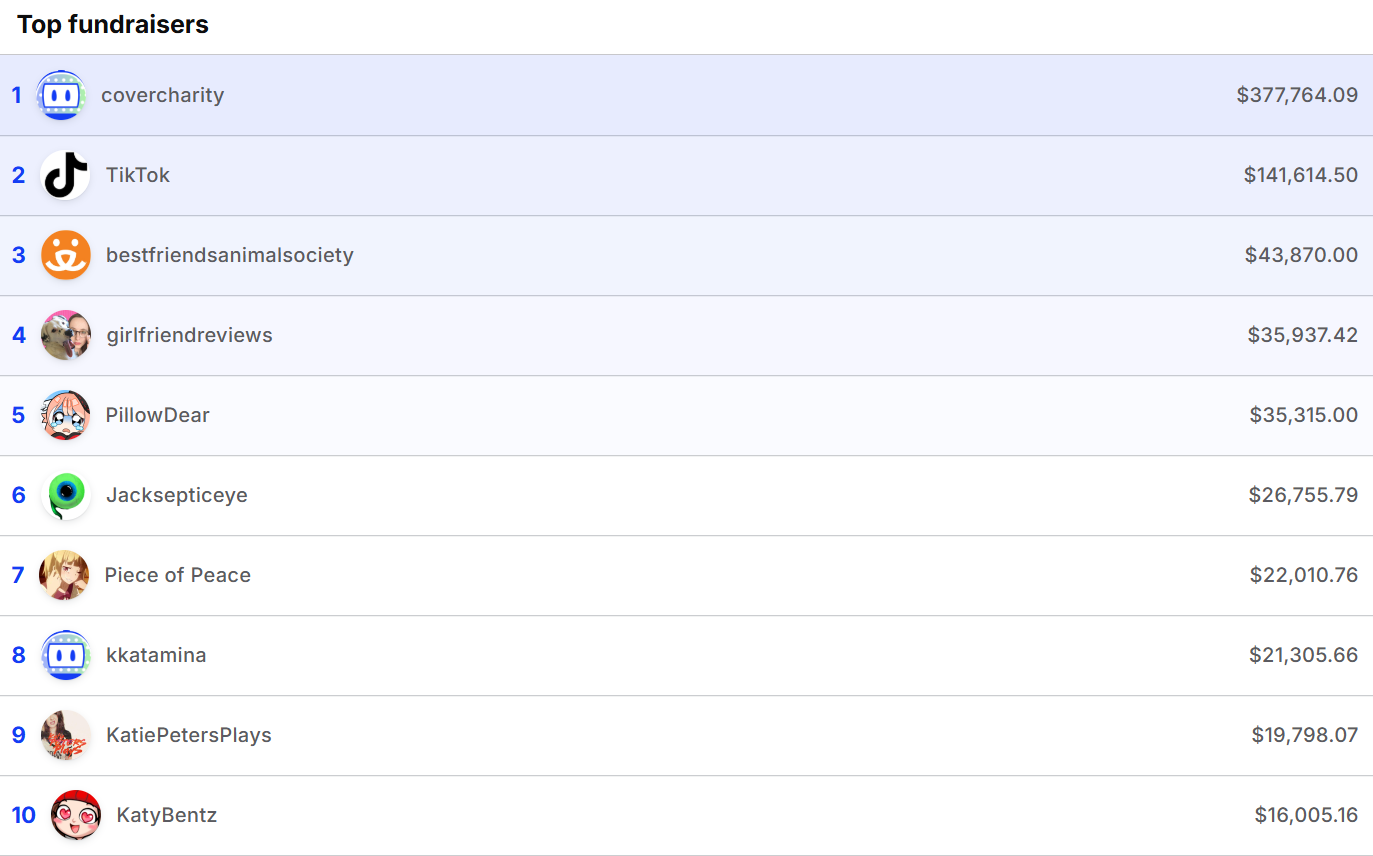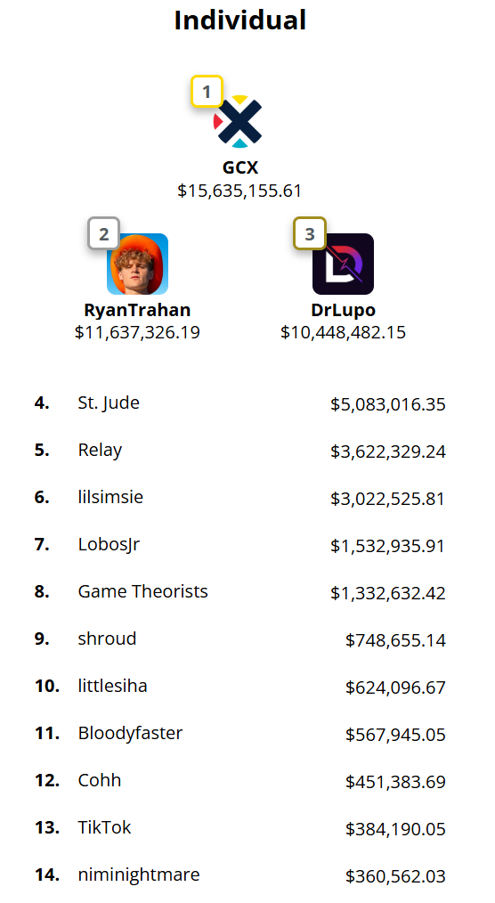 >>109577390and here's the leaderboard on tiltify for St Jude by comparison