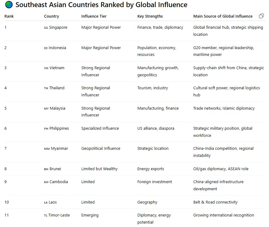 >>1095850851. Singapore2. Thailand3. Indonesia4.Malaysia5. Brunei6.Vietnam7. Philippines8. Cambodia9. Laos10. East Timor11. Myanmar