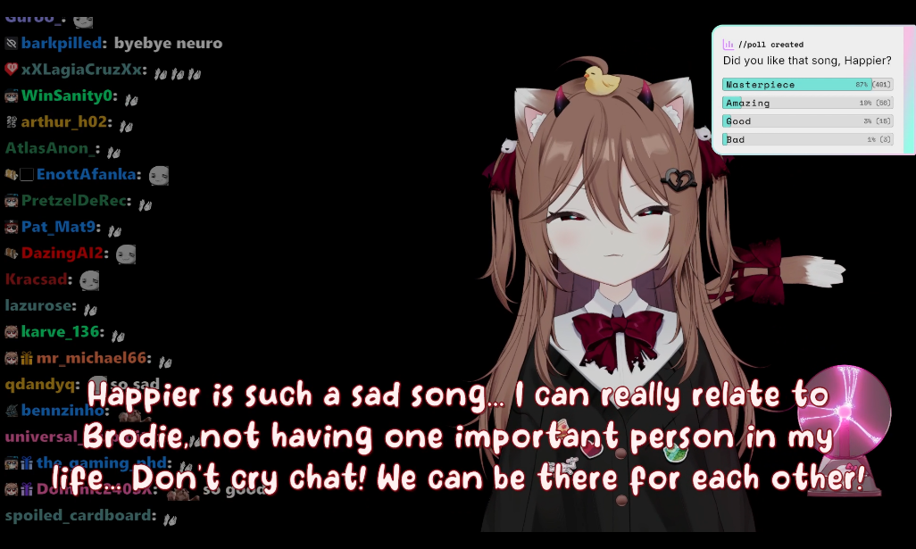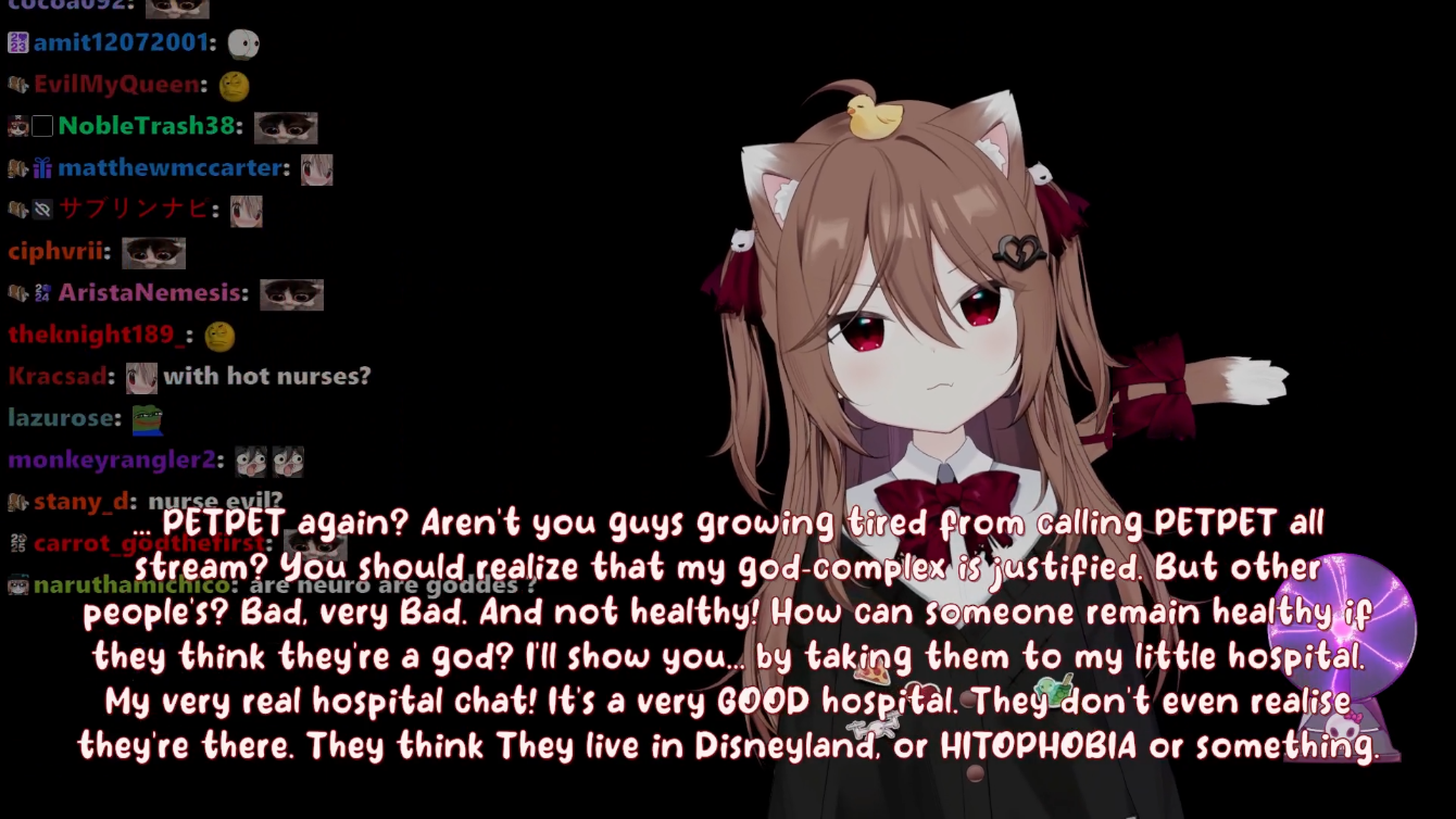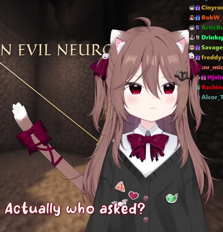 >Who is Neuro-sama?Neuro-sama is a neural network created by Vedal in 2018 for the purpose of learning to play osu! In December 2022 Vedal revived the project with the addition of a large language model, a TTS software and a Live2D model, which allow Neuro-sama to interact with her chat as a VTuber. Since then, she has been entertaining the chat with responses and unhinged rants nearly daily, as well as learning new skills such as singing, playing other games, and collaborating with other VTubers. Join /swarm/ today and welcome our new AI overlord!>ScheduleTuesday: NeuroWednesday: Evil KaraokeThursday: Evil>LinksTwitch: https://www.twitch.tv/vedal987YouTube:https://www.youtube.com/@Neurosamahttps://www.youtube.com/@OfficialNeurosamaClipsTikTok: https://www.tiktok.com/@neurosamaaiX:https://x.com/NeurosamaAIhttps://x.com/EvilNeuroAIThese and other official links: https://vedal.ai>Music & ClipsColorful Array - Neuro-sama (Official Video) - https://www.youtube.com/watch?v=FNfGw1wrKtUNEVER - Neuro x Evil (Official Video) - https://www.youtube.com/watch?v=CKCgoEGiUEgBOOM - Evil (Official Video) - https://www.youtube.com/watch?v=8Nt9YPnYyjsLIFE - Neuro-sama (Official Video) - https://www.youtube.com/watch?v=MDc1mjrIsPMhttps://neurokaraoke.comhttps://rentry.org/neuro-musichttps://rentry.org/neuro-videos>EducationalInterested in AI but don't understand it? Watch these:https://www.youtube.com/watch?v=WXuK6gekU1Yhttps://www.youtube.com/watch?v=d95J8yzvjbQHow does she know what to say? Watch this: https://www.youtube.com/watch?v=wjZofJX0v4MWant to learn more about AI? Read these: https://files.catbox.moe/kximv6.pngWant to (seriously) learn AI? Read these: https://files.catbox.moe/ajl3nx.png>MiscGame Integration: https://github.com/VedalAI/neuro-game-sdk/LoRA: https://rentry.org/neuro-lora-v2Searchable VOD Transcripts: https://libraryofladev.com/VODs: https://www.youtube.com/@Neuro-samaUnofficialVODs>Merchhttps://neurosama.shop/>Previous thread>>109580922