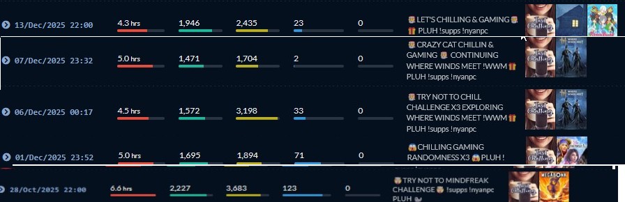 Does anyone happen to have a copy of these nyanners vods?---2025-10-28 TRY NOT TO MINDFREAK CHALLENGE !supps !nyanpc PLUH 2025-12-01 CHILLING GAMING RANDOMNESS X3 PLUH !supps !nyanpc 2025-12-06 TRY NOT TO CHILL CHALLENGE X3 EXPLORING WHERE WINDS MEET !WWMPLUH !supps !nyanpc2025-12-07 CRAZY CAT CHILLIN & GAMING CONTINUING WHERE WINDS MEET !WWM PLUH !supps !nyanpc2025-12-13 LET'S CHILLING & GAMING PLUH !supps !nyanpc---One of my drives crashed recently and it messed up my drive. I was able recover some vods but these last 5 vods were corrupted beyond repair. I have whatever was left of these vods from nyans vod channel but I prefer complete vods for archival purposes.
