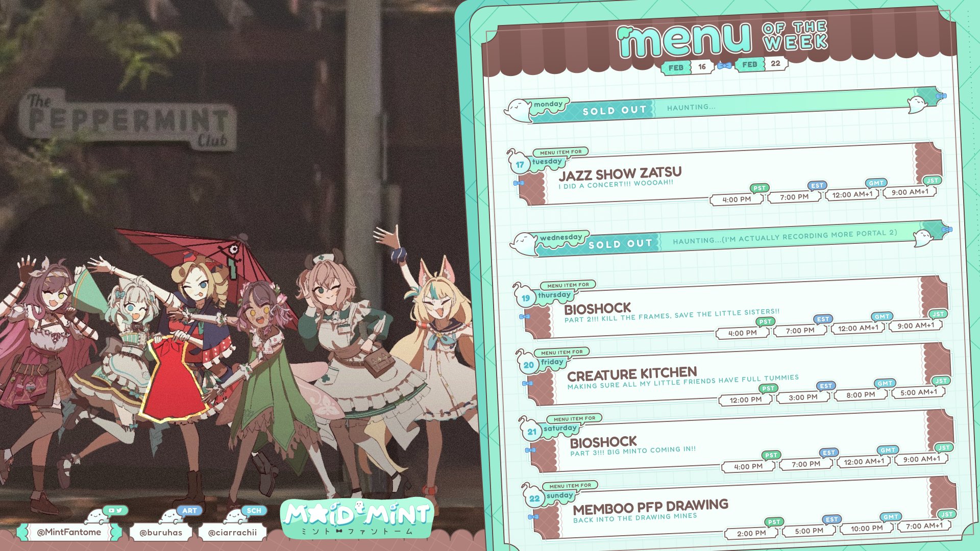 Oyakodon Cafe Returns Edition>Her YouTubehttps://www.youtube.com/@mintfantome>Her Membershiphttps://www.youtube.com/playlist?list=UUMOcHHkJ98eSfa5aj0mdTwwLQ>Her Twitterhttps://twitter.com/MintFantomehttps://twitter.com/mintwooooo>Her Blueskyhttps://bsky.app/profile/mintfantome.ghostmaid.cafe>Twitter Spaces, Concerts, Conventions, etc.https://mega.nz/folder/f0MmFYRK#Sd2dbdggLSpw5rAs1SNY6ghttps://rentry.org/MintoConPart2>Unarchived Karaokeshttps://rentry.org/MintoKaraoke>Merchhttps://shop.oshispark.com/https://shop.moso.moe/mint-fantome/https://setsuna.pro/collections/mint-fantomehttps://setsuna.pro/collections/densetsu-exe>Gameshttps://mintfantome.itch.io/freak-or-treathttps://gioba-games.itch.io/fantome-no-nazohttps://gioba-games.itch.io/mintos-autocror3cthttps://gioba-games.itch.io/mint-n-friendshttps://ruzzfe.itch.io/second-button>Musichttps://www.youtube.com/watch?v=ccfSO2XJ67Yhttps://www.youtube.com/watch?v=Yj41JI-jmbshttps://www.youtube.com/watch?v=78NqcZGPfBUhttps://www.youtube.com/watch?v=quKNBWKmNH8https://www.youtube.com/watch?v=gz7xnpVB5OYhttps://www.youtube.com/watch?v=fnko4D9dQUghttps://www.youtube.com/watch?v=FT9IdLhAjLghttps://www.youtube.com/watch?v=EAwmnsxR1Lghttps://www.youtube.com/watch?v=4P3l3sTMYOwhttps://www.youtube.com/watch?v=dEj-WEGnx58https://www.youtube.com/watch?v=ke82vnl8_L0https://www.youtube.com/watch?v=UqI_a48RLj8https://www.youtube.com/watch?v=E2Y_Iv1P-t8https://www.youtube.com/watch?v=ExFMPZIK4pMhttps://www.youtube.com/watch?v=9-bXmJ9t5Zkhttps://www.youtube.com/watch?v=RsnpplOJ-vI>Our Divegrass teamhttps://implyingrigged.info/wiki//mint/Previous thread: >>109579362