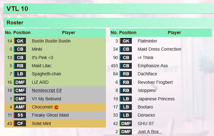 DIVEGRASS ANCHOR>pic relatedThe new squad is assembled, this is our team for VTL 10. Thank you for all who participated with ideas and with your votes.What we need right now:>New billboardsWe got a few ones already, but don't feel discouraged to make even more.>New emotesSmol images that can be spammed in the cytube chat. Size 100x100px>New chantsAudioclips up to 40 seconds long with something funny that will be played during matches. In general soundposts can be used for reference>Models, HYPs, etcAs always, any form of content and offer to help the team is greatly appreciated!>New signature Audio!If you check our Wiki, we have a highly personalised Audio Export with signature goal horns and MVP Vanthems for every medal player who isn't the Captain: https://implyingrigged.info/wiki//mint/#Signature_Goal_Horns_&_MVP_VanthemsNow, some of the players with signature goal horns left the squad or moved positions, so these have to be replaced.Do you have any ideas? What do you want to hear?For example, Densexo could run with https://www.youtube.com/watch?v=ExFMPZIK4pMDensetsuMVPs.Please tell me your ideas!For gameplay purposes, Nonmedal players with these signature horns will become buffed players. We may have 8 of them, the image shows them as Fullbacks, but I'm not 100 % sure yet how to properly deploy them.