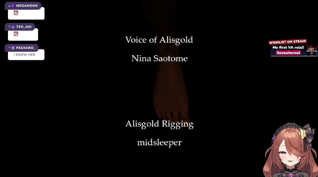 Nina is playing Love Eternal! She is in the game!https://www.twitch.tv/ninaninin>who is Nina?Welcome to /nina/! This thread is dedicated to Nina Saotome, an indie VTuber and VSinger. Her content includes gaming (retro, kusoge, RPGs...), zatsudan and singing.She is known for her powerful and sultry singing voice, her sisterly personality and her hard work.>Interested in how Nina sings?Here is a small selection of her covers:https://www.youtube.com/watch?v=e8LkXeuwkwwhttps://www.youtube.com/watch?v=Tgf6qWaGuPAhttps://www.youtube.com/watch?v=MMF38a9B-n4https://www.youtube.com/watch?v=MXjuMwcvpQM>Other links and resources>Youtubehttps://www.youtube.com/@NinanininVT/videos>Twitterhttps://x.com/ninanininvtR18: https://x.com/hashtag/Ninintai?src=hashtag_click&f=live>Unofficial VOD archivesNew: https://youtube.com/@NinaVODsOld: https://youtube.com/@annalsoflevtia2846>Unofficial archive of various lewd OC, KK and sloppahttps://mega.nz/folder/hzcijZBD#TeezhbzpKoJulQTSvgzn9w>Related threadsLarge indies >>>/vt//lig/Western VTubers >>>/vt//wvt/Previous thread: >>109569242