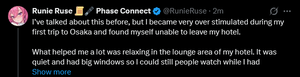 >>109623155Let me translate: I actually went out drinking with strangers but I'm telling idiots that I stayed holed up in my hotel.