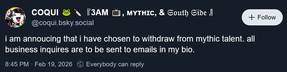 Coqui just announced that she left Mythic. The business email in her bio goes to 3AMhttps://bsky.app/profile/coqui.bsky.social/post/3mfaycwsasc2j