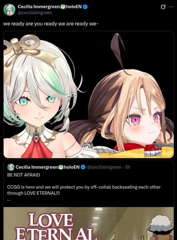 The 712th Wind>NEXT STREAM: Friday 2pm CET Justice(-Rao) collab on ERB's channelLink pending>LAST STREAM: FORCING EVIL GREMLIN TO PLAY EVIL GAME【GO LIVE FOR LOVE】CCGG off-collab!https://www.youtube.com/watch?v=xs32yiaj8AI>Links:YouTube: https://www.youtube.com/@holoen_ceciliaimmergreenTwitter: https://twitter.com/ceciliaimgreenImportant Videos: https://rentry.org/ImmerMarks>Music:https://rentry.org/ImmerPiece【Hololive EN Justice】ABOVE BELOW- https://www.youtube.com/watch?v=ilLEj-SCCn8【Cover】 Forgotten Words | 忘れじの言の葉 #歌ってみた - https://www.youtube.com/watch?v=twto2g0FwTQ【Hololive EN】Odyssey - https://www.youtube.com/watch?v=0wO8d70KSXw【ENReco Orisong】Oh Princess - https://www.youtube.com/watch?v=5x9ix5CGmoo【CCGG Cover】Naimononedari / ないものねだり - https://www.youtube.com/watch?v=Qq-fgjrc-uc【CCGG Cover】Turing Love / チューリングラブ - https://www.youtube.com/watch?v=hX_3P0TBGP4【Hololive EN】 All for One - https://www.youtube.com/watch?v=ok24HgzbeLs【Hololive EN Justice】RENEGADE - https://www.youtube.com/watch?v=xg6DUmRRXlw【Cover】nevermore / ネヴァモア -https://www.youtube.com/watch?v=FZkkGB2bUyo【Original Song】Wind-Up - https://youtube.com/watch?v=Kqh6-vjars8>Merch:https://rentry.org/ImmerMerchHoloPro: https://shop.hololivepro.com/en/collections/ceciliaimmergreenGeekJack: https://shop.geekjack.net/pages/hololive>Tags:#ImmerScreen (Stream) https://twitter.com/hashtag/ImmerScreen#Immergination (Art) https://twitter.com/hashtag/Immergination#ImmerPiece (Music) https://twitter.com/hashtag/ImmerMusic#ImmerMemes (Memes) https://twitter.com/hashtag/ImmerMemes>/grün/ OP Template:https://rentry.org/ImmerTemplate>Previous Thread: >>109598583