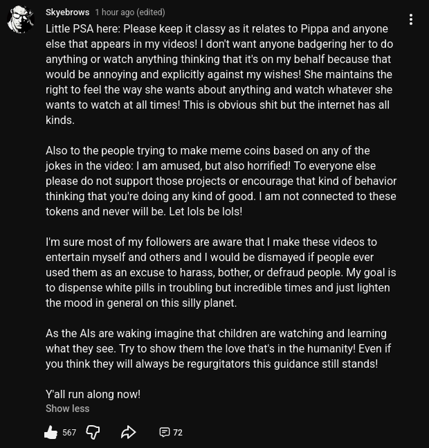Skyebrows has utterly destroyed Pippas remaining aura. He wanted her approval because he saw her engaging with AI and enjoyed her old content. She shat oh him so he sent a self-depricating love letter to her, seeking reconciliation. She refuses to engage because shes jaded. The dude is building a literal cinematic universe of 1-2 views and completely exploding their audience sizes. Yes, its slop, its clout chasing, its cringe. But dude has got serious momentum and will only continue to improve and grow. She will likely never understand how poorly she fumbled this moment.