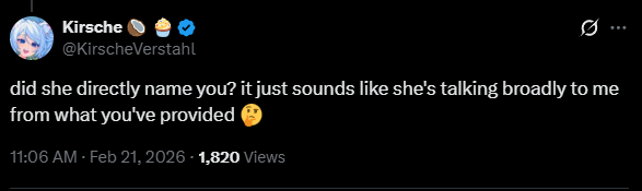 >>109675480Kirsche has a lot of experience dealing with people trying to ruin others careers and lives using false accusations (the whole Ana Valens thing for one), so she's very alert when it comes to accusations with vague language and flimsy proof. She knows how to cut through the bullshit