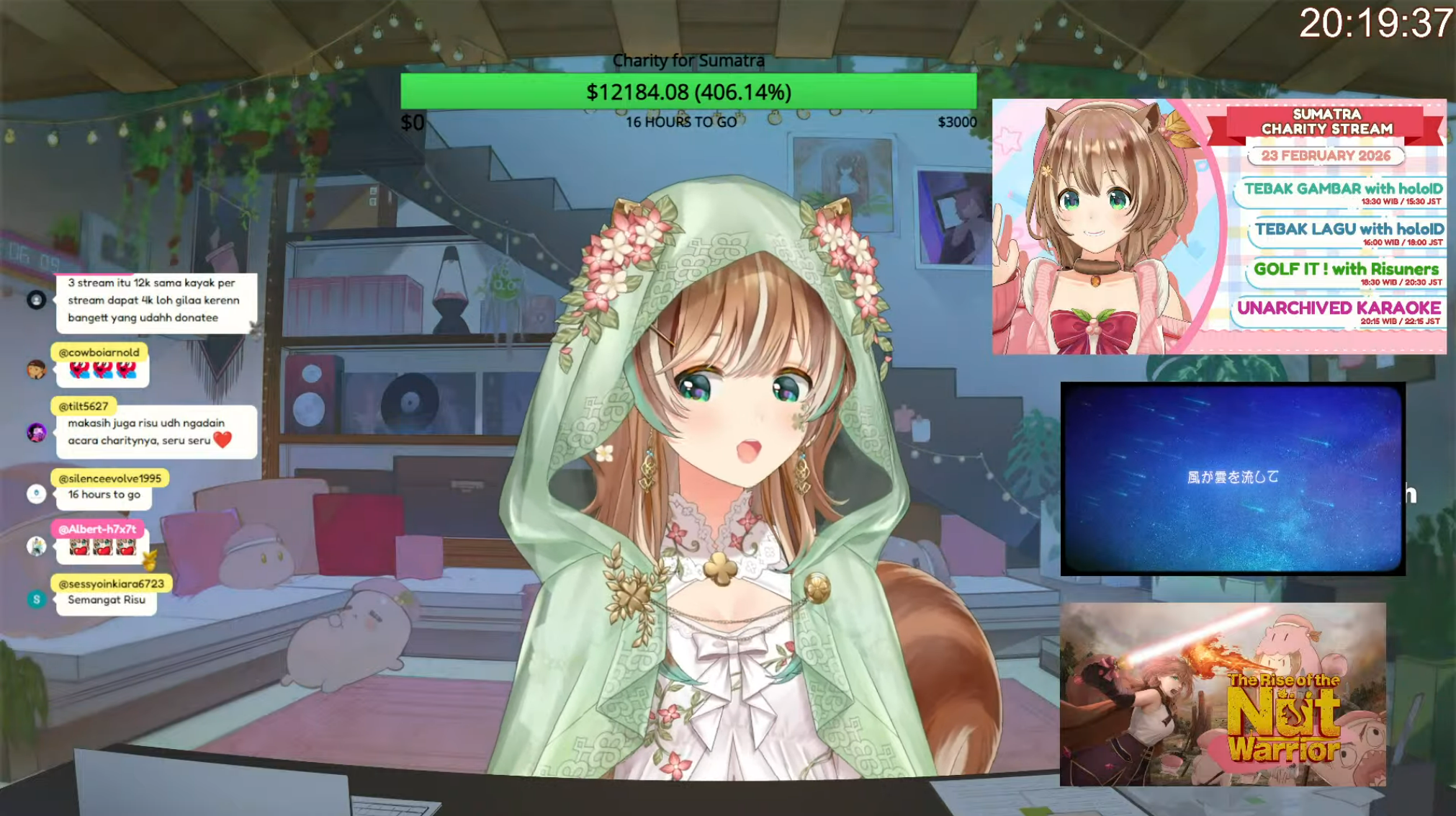 Four risu streams!https://www.youtube.com/watch?v=ZoTWzSN5qJIhttps://www.youtube.com/watch?v=67-oZwluHoghttps://www.youtube.com/watch?v=AzaSFs15d78https://www.youtube.com/watch?v=gMhb6gK04R4