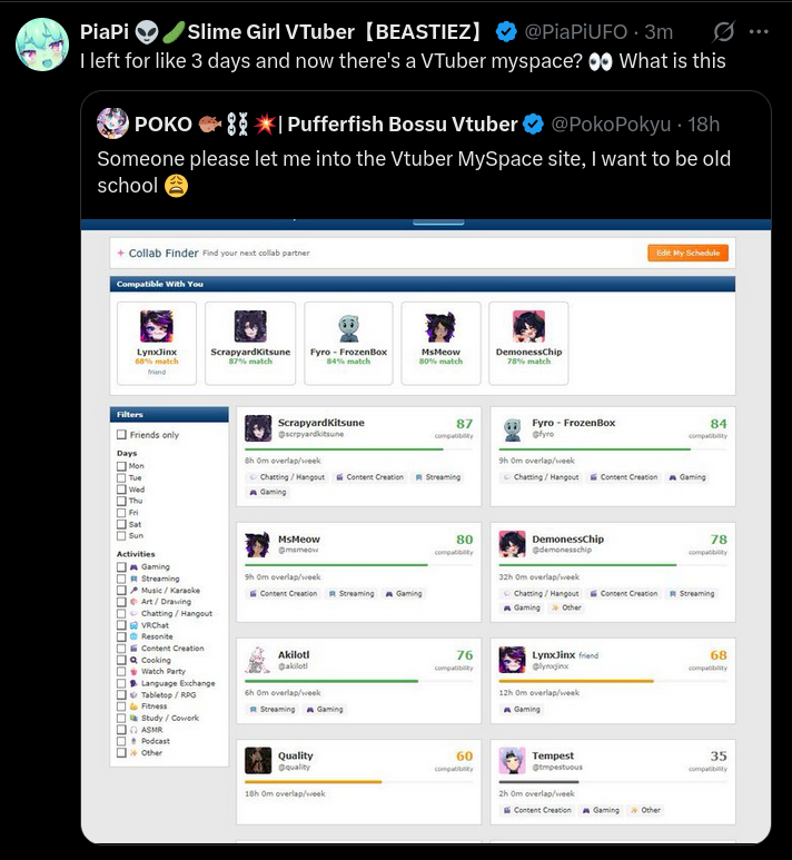 >>109699368I cant wait to hear vtubers complain about how no one wants to befriend them on vtuber myspace because their views are too low