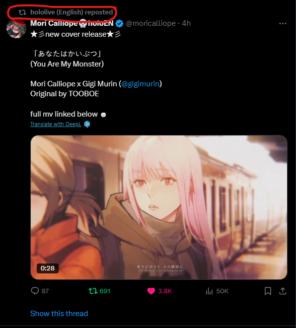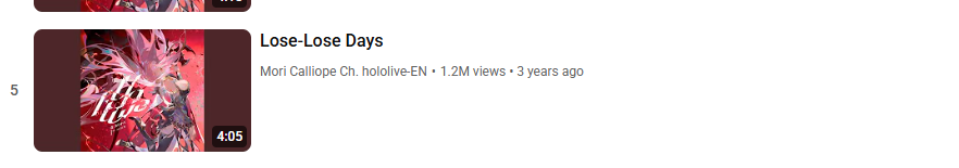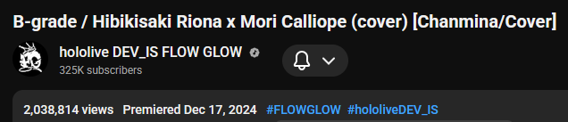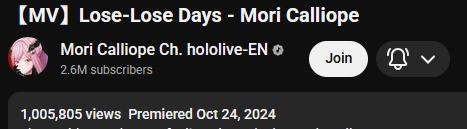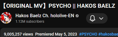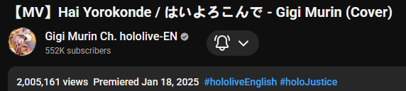>>109742533https://youtu.be/qfcW4ygzkTEEN songs in the Hololive weekly top 100 Feb 15-21 (1st week songs excluded):>88) Go-Getters (Mori Calliope) - 39,158 views>87) Kaibutsu (FUWAMOCO) - 39,377 views>84) PSYCHO (Hakos Baelz) - 39,667 views>79) Daidaidaidaidaikirai (Hakos Baelz/Ouro Kronii) - 42,319 views>76) Kira Killer (Zutomayo feat. Mori Calliope) - 42,698 views>74) Orpheus (Mori Calliope) - 43,458 views>69) All for One (Hololive English) - 45,290 views>62) Love Me Love Me Love Me (Nerissa Ravencroft) - 47,466 views>53) KING (Gawr Gura/Mori Calliope) - 52,398 views>49) III (Amane Kanata/Koganei Niko/Mori Calliope/Ayunda Risu/Elizabeth Rose Bloodflame) - 53,993 views>39) EGO (Takanashi Kiara) - 65,271 views>35) TAKEDOWN (AmaLee/Bao/Mori Calliope) - 78,628 views>28) LET'S JUST CRASH (Mori Calliope) - 83,558 views>26) ROCK IN! (Koseki Bijou) - 84,132 views>25) Team Tomodachi (Advent) - 85,961 views>23) OYOME HOLIC (Nerissa Ravencroft) - 86,855 views>18) TAKO∞TAKOVER (Ninomae Ina'nis) - 97,598 views>13) Ash Again (Gawr Gura) - 120,728 views>11) Rabbit Hole (Nerissa Ravencroft) - 125,803 views>9) Your Idol (Nerissa Ravencroft/Mori Calliope/Ouro Kronii/FUWAMOCO) - 133,706 views New:>Koi (Myth) - 154,258 views>Monsters and Men (Shiori Novella) - 256,401 views>Ridin' on Dreams (Sakura Miko/AZKi/Shirogane Noel/Tsunomaki Watame/Yukihana Lamy/Airani Iofifteen/Nerissa Ravencroft/Ichijou Ririka) - 80,347 views Notes:Silhouette falls off the list. Rabbit Hole makes the list in its first week. Gold Unbalance (Mori Calliope feat. Nakajima Kento) has been removed from the list, likely for copyright reasons. Any of the new album tracks from Mori Calliope, Takanashi Kiara, and Ninomae Ina'nis that may have made the list this week were not added by the uploader.