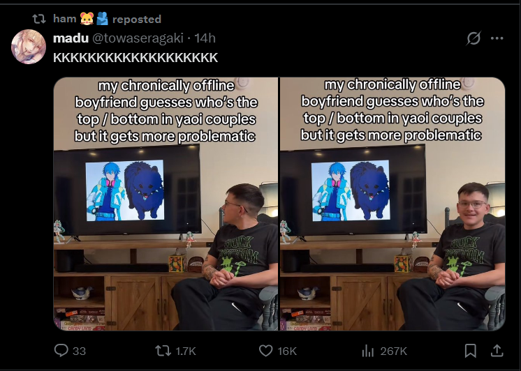 >>109743414No homo is fucking anything, he would be flaunting his girl on stream if they were.