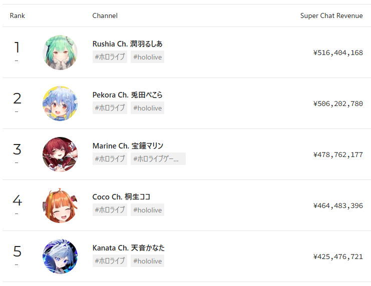 >>109754309It's funny to me that until very recently (as in only within the last y months) she was beaten in total superchat revenue overall (not just vtubers) only by two weird televangelist channels. God and Rushia. Sadly now there's some NFL channel and some Spanish TMZ thing.