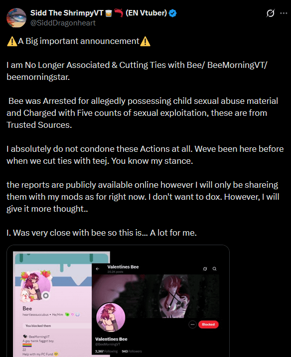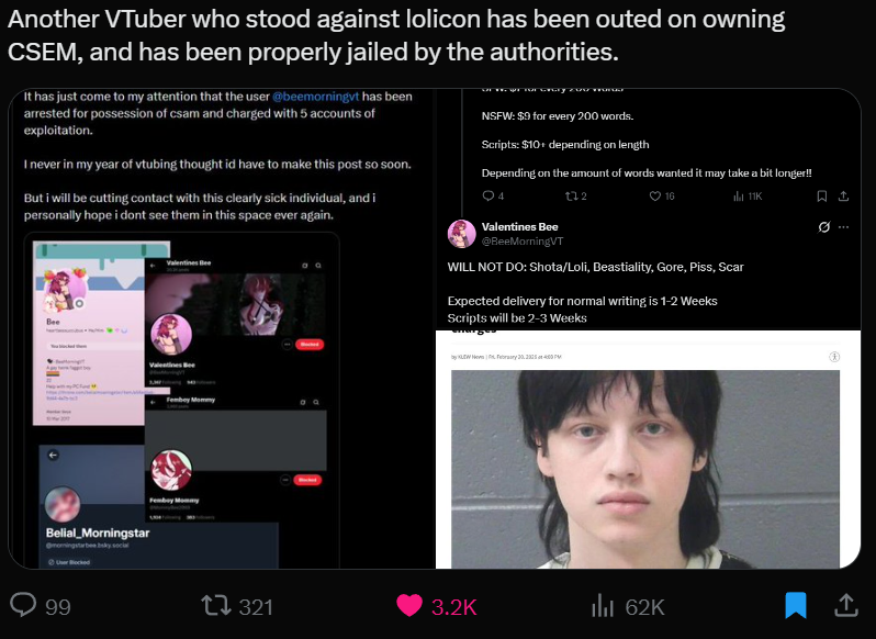 Male indie BeeMorningVT has been arrested for possession of CP, resulting in numerous other indies and artists connected with him to release statements distancing themselves and condemning him.https://x.com/SiddDragonheart/status/2026021568359600291https://x.com/JayBlogsGaming/status/2026013740198404204https://x.com/mrslimeva/status/2026152880403599744https://x.com/RiikochanArt/status/2026097213617873386