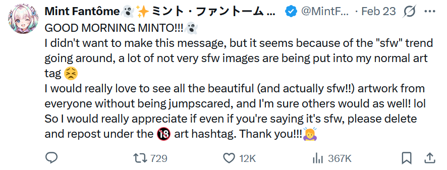 You dumbfucks, she's saying this because of the recent trend where people post straight up porn art but tag it as SFW. Most notably the trend of drawing girls rubbing their bare naked pussy on the edge of a desk making it look like a cat. It's fucking retarded and these artists should genuinely have their accounts locked for it especially if they intentionally use mint's SFW hashtag.