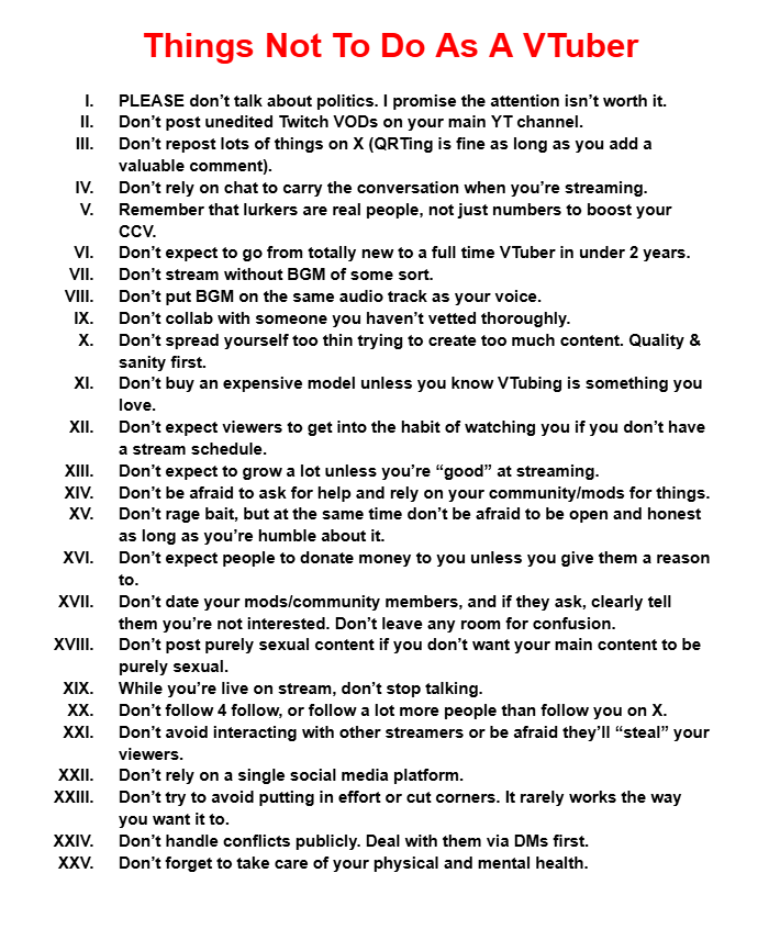 224 - Rawr Edition>What is /asp/?/asp/ is a thread for Vtubers to give and receive advice related to Vtubing.>Should I stream on Twitch or YouTube?Most people would recommend against streaming on YouTube if you don't have an established subscriber base for making videos. Also consider multistreaming, it's free but resource intensive.>Is there an audience for X?Would you watch someone do X?Is someone already doing X?>What video editor should I use for editing clips?DaVinci Resolve, Kdenlive, & CapCut if you don't feel like spending money or pirating; otherwise, use Vegas Pro or Premiere.>I have a question, is it okay to ask? Will I get real feedback?Ask away! If no one responds, try asking again at a later time.>I see the rentry! How do I join?Just DM letmebeyouranchor on discord to join! Is an opt-in and you can always request to be removed later on!Open company auditions:Brave: https://bravegroup.co.jp/audition_en/Hololive (Open indefinitely): https://audition.hololivepro.com/enNiji (Open indefinitely): https://twitter.com/NIJISANJI_World/status/1780415989332816307Also, hololist with other minor agencies opening auditions: https://hololist.net/news/tag/audition/Useful links:General: https://pastebin.com/AJLkFrGKWhat to avoid: https://pastebin.com/vbp6qEdtOp-Sec: https://mauthedoog.medium.com/21-privacy-tips-vtubers-need-to-know-ce93082cd166Common Trolling techniques in /here/: https://pastebin.com/24DaTTvm/ASP/list: https://rentry.co/asplistRecurrent Vtuber Questions: https://pastebin.com/UXYkrALETierlist: https://tiermaker.com/create/-asp-iring-vtubers-18797104Previous Thread: >>109716769