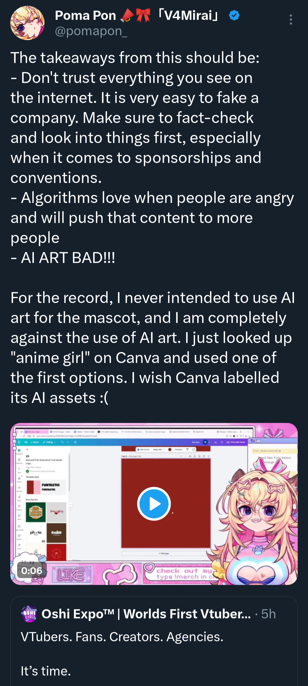At least Poma is not making her own AI assets so she might only get slightly cancelled over this