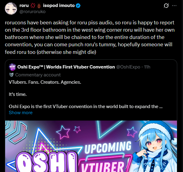 Don't know whether you're aware or not anon, but that entire convention is a joke made by a v4mira girl and all the chuubas quote tweeting it are also joking.