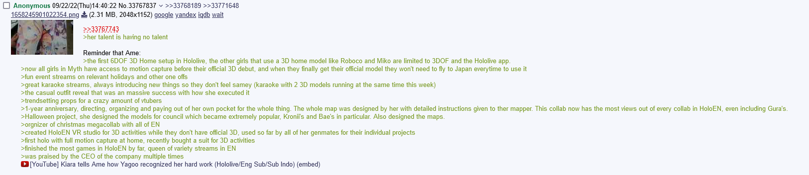 >>109807300>>109807315>>109807400I saw that image a thousand times and never noticed the date on that post before. That was literally at hololive's lowest point lmao