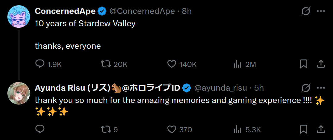 >>109805600I'm rooting for Cover even if I tease their talents on occasion (a lot). Hope they don't get absorbed into the American atmosphere entirely and remember they're presenting as a Japanese company. People want an escape from what they see every day.That's kind of the big novelty.