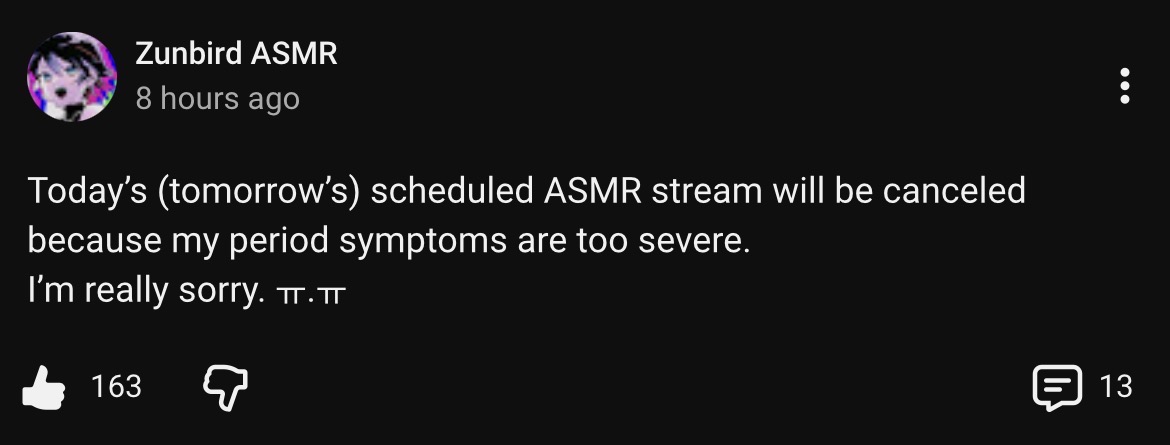 You ever think about how the majority of Vtuber problems stem from the fact that they’re women?>overly emotional and prone to causing drama>physically frail and prone to injury, forcing them to not stream during the time>even if they’re not injured, once a month their genitals will bleed and give them mood swings, making them unable to stream