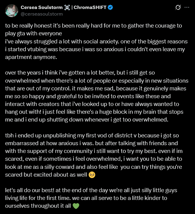>>109813384Cersea, you are grown up woman with dating experience, I can't take this shit seriously kekGetting emotional over district V of all things, "muh anxiety". My god what has small corpo vtubing descended to