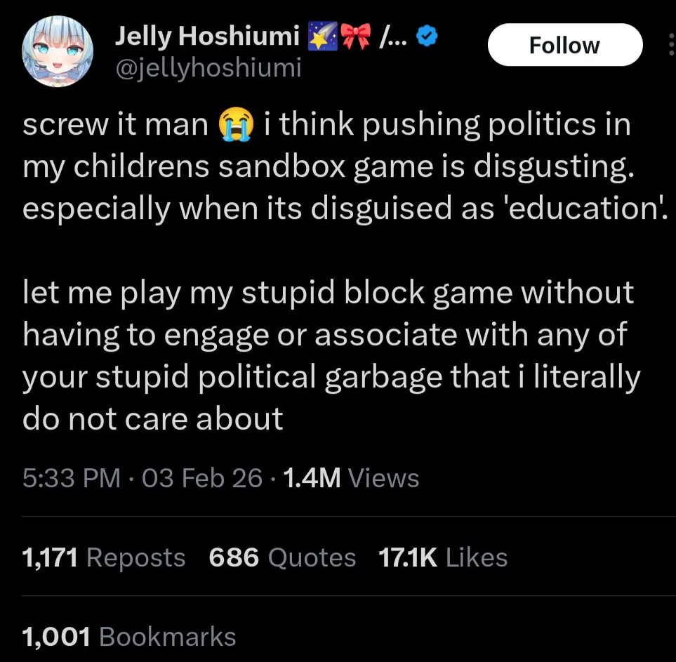 Because, and I know you're going to bitch and moan about this, Jelly was full of shit here. She was bitching about a major historical event being taught about in the educational version of the game, which she did not have to interact with AT ALL in the main version of the game. Not everything boils down to "BUT THIS IS WOKE! THIS IS NON-WOKE!" Sometimes people's complaints really are just fucking retarded.