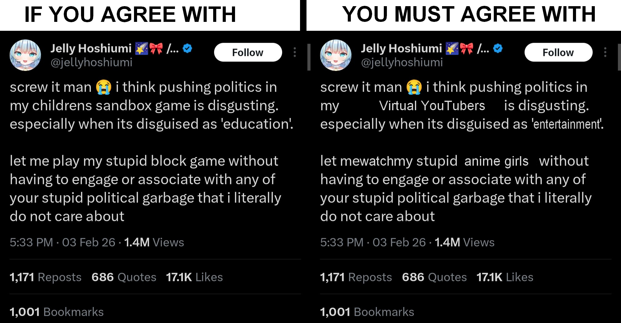 I'm not left-wing nor right-wing. The left wants to take away vtubing because the industry is degrading to women, and the right wants to take it away because it runs counter to religious and traditionalist ideals. Both use the same tactics and are in essence the same. Either side bringing politics into the entertainment is unwelcome, both are pariahs for different reasons, and both sides will never have a legitimate seat at the table in the vtuber industry. Your views don't matter to me, my oshii, or to chat. Your politically aligned vtuber model doesn't matter to me either. You're trying to control a narrative in a dying world, and I'm gonna continue to watch retarded 36 year old Japanese women use oversexualized avatar models play videogames wether you like it or not.