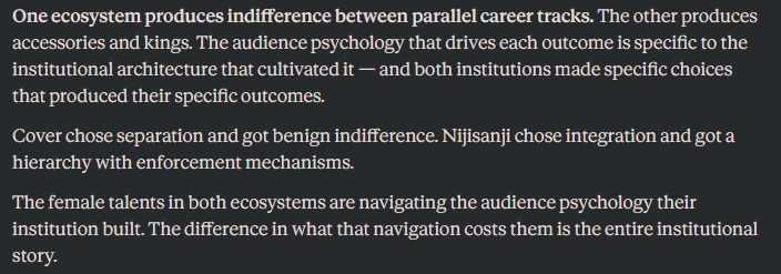 >>109825942is he wrong? Cover has a million excuses as to why they're overworking their talents and can't change shit to fix it, but have only one playbook which is to cry muh nijifans bullying me
