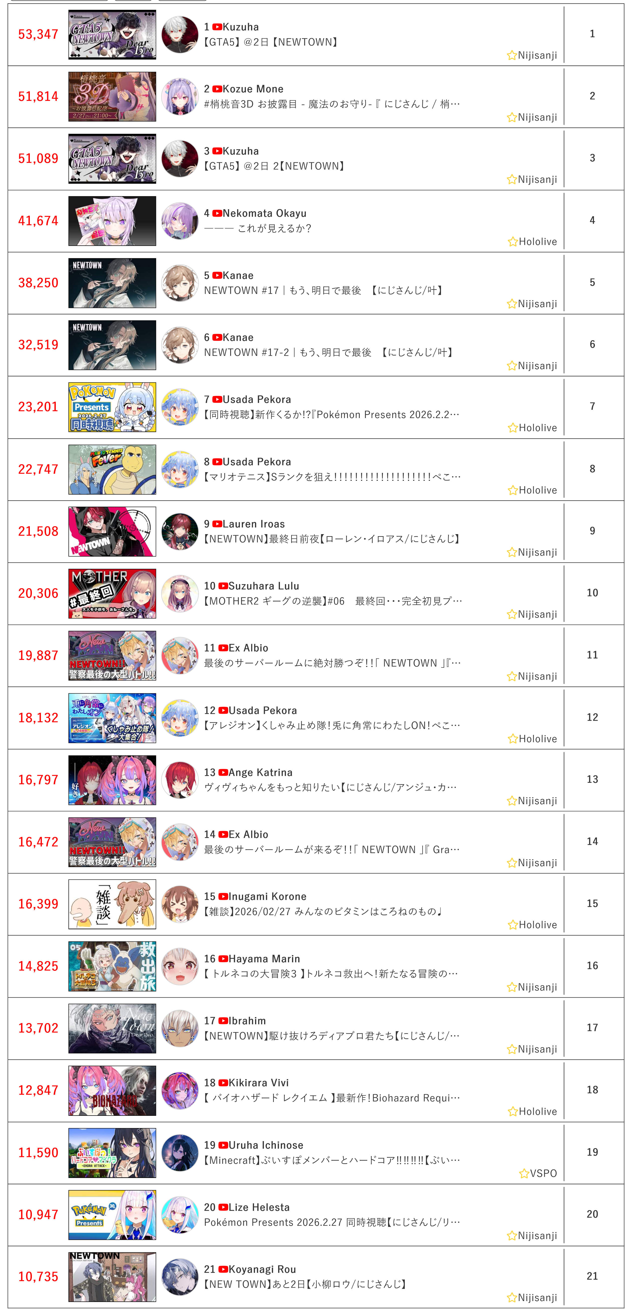 *GENERAL NUMBERFAG SITES*>https://playboard.co/en/>http://ikioi-ranking.com/>https://vrabi.net/>https://live-ranking.userlocal.jp/vtuber-rankingHololive sites>https://www.hololyzer.net/youtube/index.html>https://trackholo.live/en/>https://holo-spotify-stats.jirikunes.eu/Twitch>https://sullygnome.com/>https://twitchtracker.com/>https://stats.roki.sh/>https://streamscharts.com/