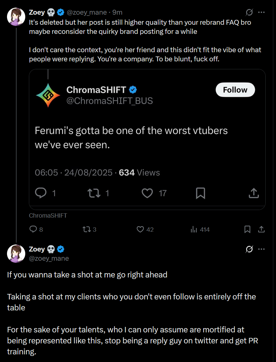 >>109852961Ferumi also told him to drop it and let it slide but zoey went back a day later and tried to stir up shit again going against ferumi's wishes