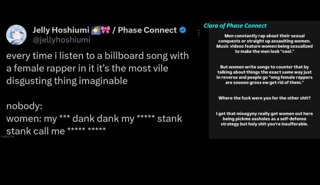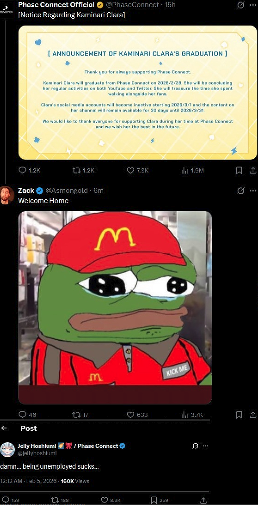 As someone who watched Clara from the start of her debut in Phase, this was cringe and sad. She's clearly bitter as hell and went out of her way to stir-up the drama tourists and twitter mob on the way out(as much as she could within what I assume are the confines of her contract and avoiding getting sued by Fishman). The political brain rot is clearly terminal. I was a bit sad about seeing Clara go before but at this point it really is for the best that her and phase part ways. Hopefully she can spare us and herself the indignity of a dramatourist media circus but I'm not getting my hopes up.