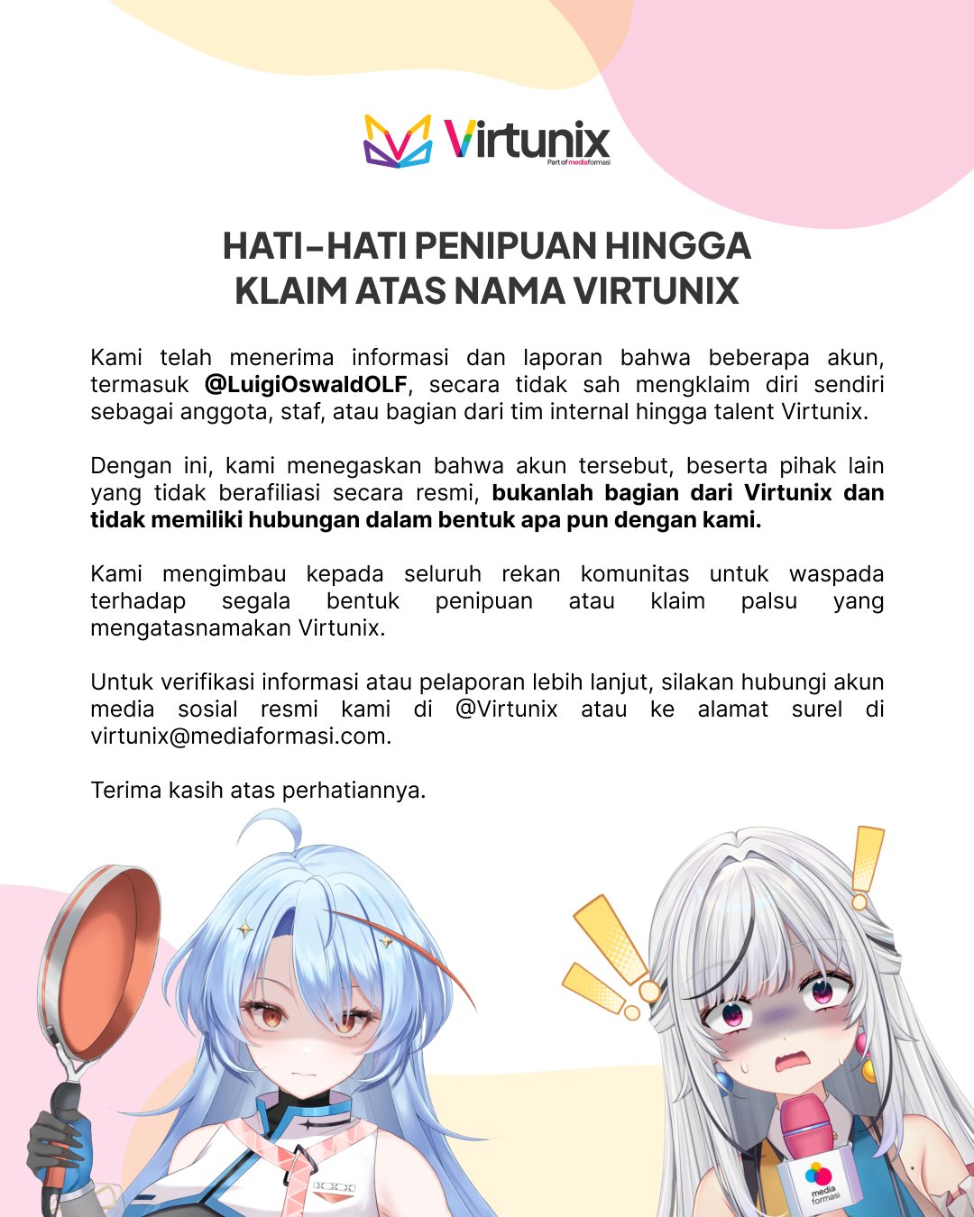 >>109845261Virtunix announced a caution against frauds that try to pose as them.https://x.com/virtunix/status/2026229853503295939As a warning, they encourage to verify information to their official channels at Virtunix official social medias and e-mail address at:virtunix@mediainformasi.com