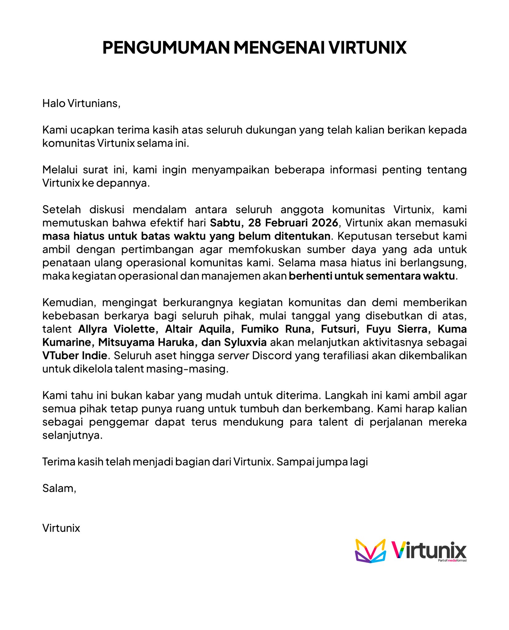>>109845261Virtunix will be halting their managerial operation for an indefinite period. https://x.com/virtunix/status/2027613911269445724In the meantime, all current talents under their umbrella are now indie VTubers, effective immediately.
