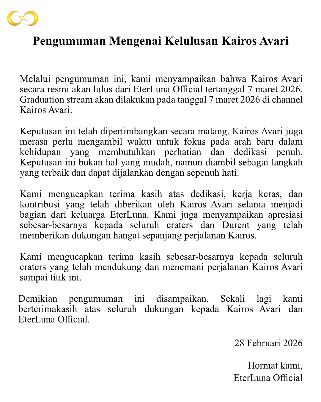 >>109845261https://x.com/eterluna_id/status/2027614227301863522Kairos Avari to grad from EterLuna on March 7 due to shifting RL priorities