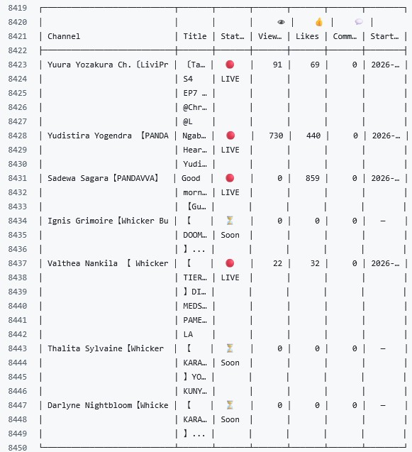 >>109847619I'm still testing it for various things, hence I'm not including it in the OP.But yeah, this is just a proof-of-concept that you can build your own VStats. I still need to figure things out on how to scale up the tracker and database size in the event that I need to track other people, while keeping things cost-efficient at the same time>t. the usual OP