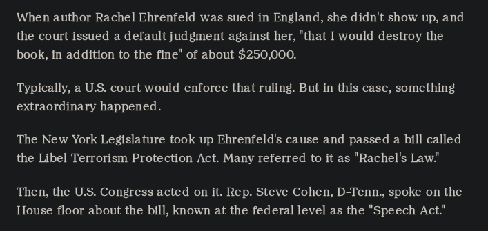 >>109850806They could go after the people who made videos and tweets about it as well, not just the TVA people. Even just tweeting something counts as a publication in this context.>>109850794Rulings are usually enforced across countries due to treaties and shit. The SPEECH Act in the US was literally created because normally they would just enforce whatever foreign rulings despite other countries having different standards for what counts as defamation. That said, not everyone that the corpo could go after is in the US and protected by the SPEECH Act and many countries do not have similar legislation.