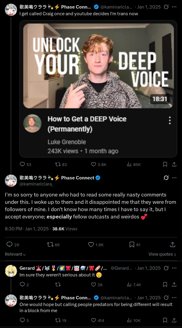 Claras problem was pointing out the irony of a catastrophe too soon because both sides of the situation are being political and Phase does it best to be neutral.This is why people go 'Pippa has changed' and dont watch her because she isnt consistently pandering to their bullshit opinions on a daily level. This is why they wont let Clara otlr Eimi promote hamfisted 'for a cause' stream ideas.Her original role was to bridge the gap between EN and JP but is clear her 'normal behaviour' scared off the JP at times. I would say Saga has done more normalising branch interaction. Other anon was right though coddling a Diva too much is a nono.