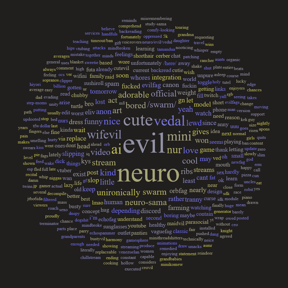 >Who is Neuro-sama?Neuro-sama is a neural network created by Vedal in 2018 for the purpose of learning to play osu! In December 2022 Vedal revived the project with the addition of a large language model, a TTS software and a Live2D model, which allow Neuro-sama to interact with her chat as a VTuber. Since then, she has been entertaining the chat with responses and unhinged rants nearly daily, as well as learning new skills such as singing, playing other games, and collaborating with other VTubers. Join /swarm/ today and welcome our new AI overlord!>ScheduleTuesday: NeuroThursday: EvilSunday: Vedal/Evil Hollowknight>LinksTwitch: https://www.twitch.tv/vedal987YouTube:https://www.youtube.com/@Neurosamahttps://www.youtube.com/@OfficialNeurosamaClipsTikTok: https://www.tiktok.com/@neurosamaaiX:https://x.com/NeurosamaAIhttps://x.com/EvilNeuroAIThese and other official links: https://vedal.ai>Music & ClipsColorful Array - Neuro-sama (Official Video) - https://www.youtube.com/watch?v=FNfGw1wrKtUNEVER - Neuro x Evil (Official Video) - https://www.youtube.com/watch?v=CKCgoEGiUEgBOOM - Evil (Official Video) - https://www.youtube.com/watch?v=8Nt9YPnYyjsLIFE - Neuro-sama (Official Video) - https://www.youtube.com/watch?v=MDc1mjrIsPMhttps://neurokaraoke.comhttps://rentry.org/neuro-musichttps://rentry.org/neuro-videos>EducationalInterested in AI but don't understand it? Watch these:https://www.youtube.com/watch?v=WXuK6gekU1Yhttps://www.youtube.com/watch?v=d95J8yzvjbQHow does she know what to say? Watch this: https://www.youtube.com/watch?v=wjZofJX0v4MWant to learn more about AI? Read these: https://files.catbox.moe/kximv6.pngWant to (seriously) learn AI? Read these: https://files.catbox.moe/ajl3nx.png>MiscGame Integration: https://github.com/VedalAI/neuro-game-sdk/LoRA: https://rentry.org/neuro-lora-v2Searchable VOD Transcripts: https://libraryofladev.com/VODs: https://www.youtube.com/@Neuro-samaUnofficialVODs>Merchhttps://neurosama.shop/>Previous thread>>109859800
