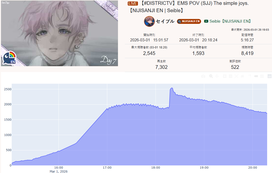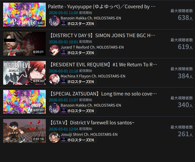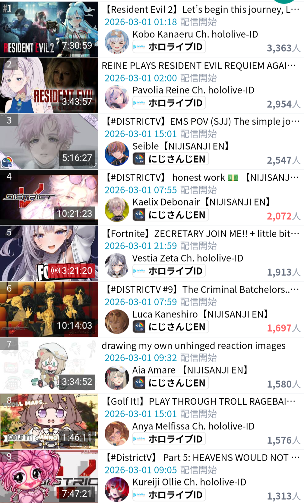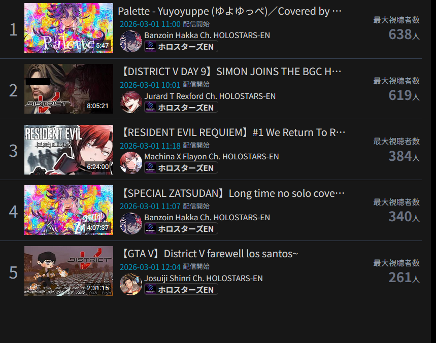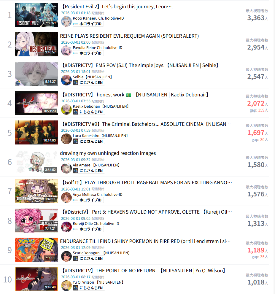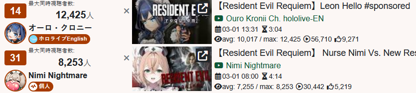 *MARCH 1ST 2026 FINAL EN TALLY*>12,425: Kronii (Hololive English)>8,253: Nimi (Indie)>6,862: IRyS (Hololive English)Very PROMISING tally. Gold for Ouro Kronii's playthrough of Resident Evil Requiem, Silver for Nimi's playthrough of that same game, Bronze for Hoozuki IRyS' last playthrough of Black Mesa.>RANKING PER POINTS (Gold = 3, Silver = 2, Bronze = 1)Kronii = 3pNimi = 2pIRyS = 1p